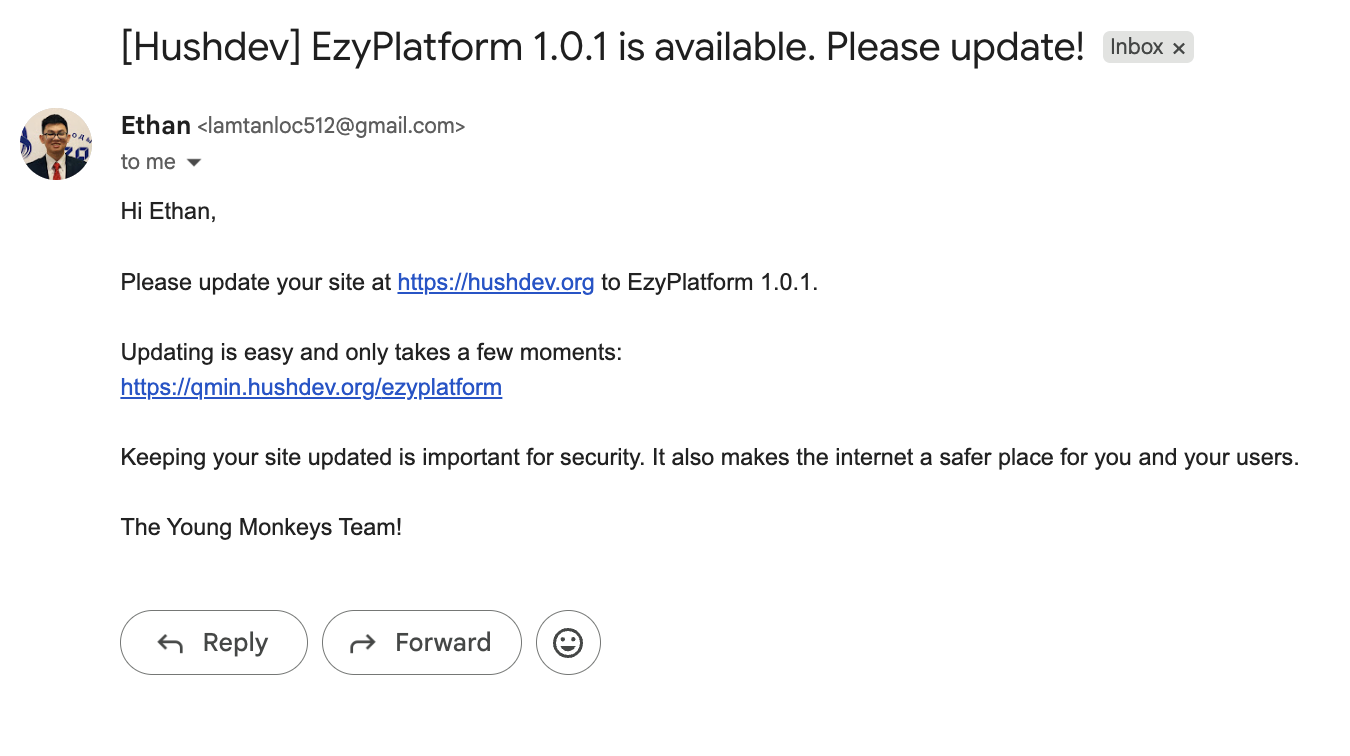 Đây là thông báo gửi mail từ vps mail cá nhân mình cài đặt trong vps, và nó gửi về hòm mail cá nhân khác của mình, rất tiện khi cần biết lúc nào có version mới để update.