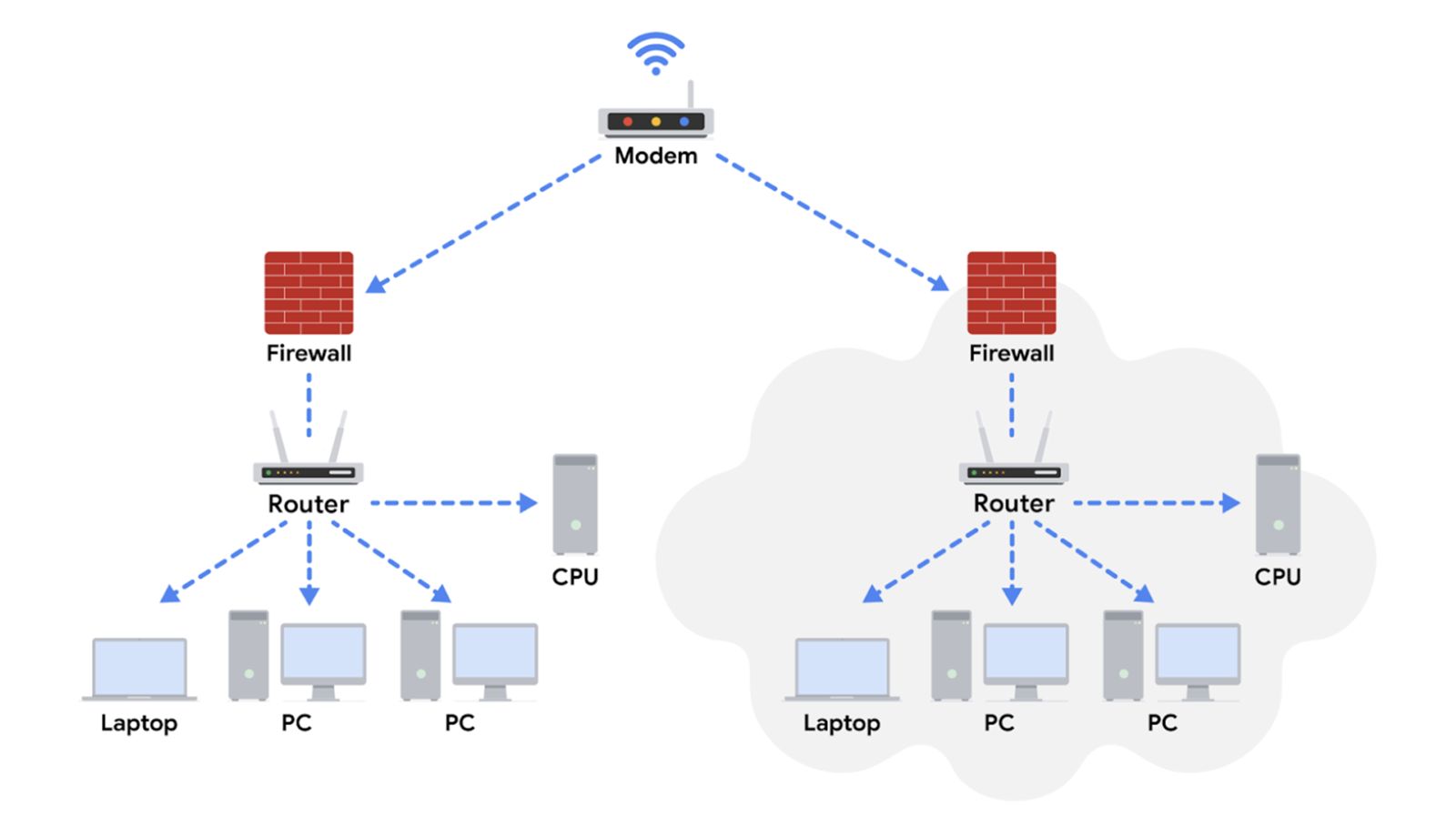 Note: In this diagram, a router connects to the internet through a modem, which is provided by your internet service provider (ISP). The firewall is a security device that monitors incoming and outgoing traffic on your network. The router then directs traffic to the devices on your home network, which can include computers, laptops, smartphones, tablets, printers, and other devices. You can imagine here that the server is a file server. All devices on this network can access the files in this server. This diagram also includes a switch which is an optional device that can be used to connect more devices to your network by providing additional ports and Ethernet connections. Additionally, there are 2 routers connected to the switch here for load balancing purposes which will improve the performance of the network.
