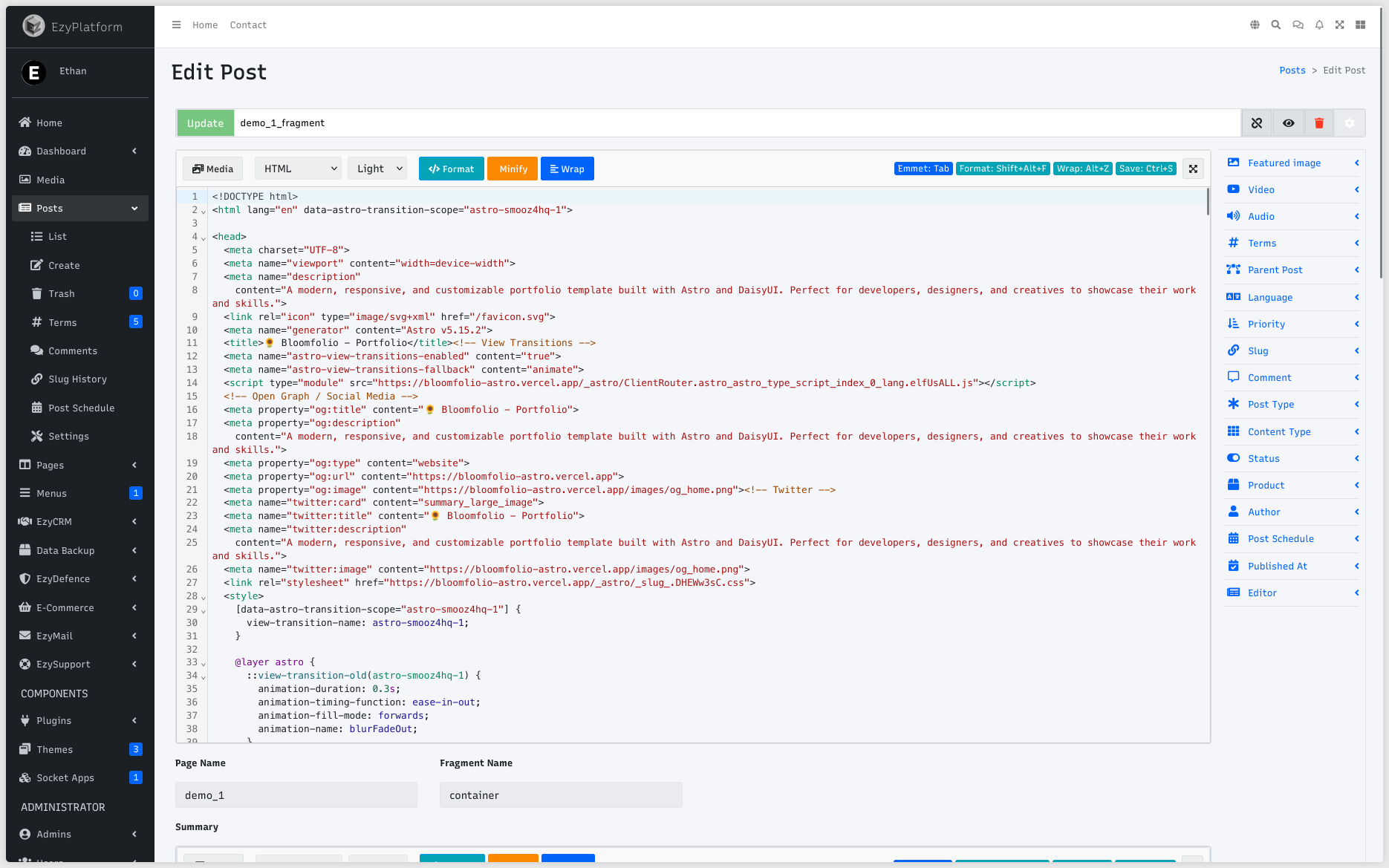 Như vậy là ta đã có một trang web cự kỳ nhanh phải không 🤣, tất cả là clone của 1 website khác, nhưng nó cho thấy răng, nếu bạn có template nào đó, có thể là từ AI gen ra, hoặc tự code frontent, hoặc bất cứ thứ gì, ezyplatform vẫn đáp ứng được.